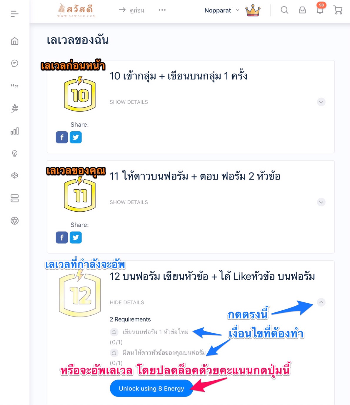 การอัพเลเวล คือการวัดความก้าวหน้าในสวัสดี กดเมนูอัพเลเวลเพื่อไปยังหน้านี้ ดูตรงเลเวลที่เป็นสีจางๆ ด้านล่าง นี่คือเลเวลที่เราจะอัพ กดตรงคำว่า Show Detail เพื่อดูเงื่อนไขที่ต้องทำ เมื่อทำแต่ละเงื่อนไข ระบบจะขีดฆ่าไปทีละข้อ และเมื่อครบเงื่อนไขทุกข้อ จะอัพเลเวลให้เองโดยอัตโนมัติ นอกจากนี้ยังสามารถปลดล็อกด้วยคะแนน โดยการกดปุ่ม Unlock และ กด Yes